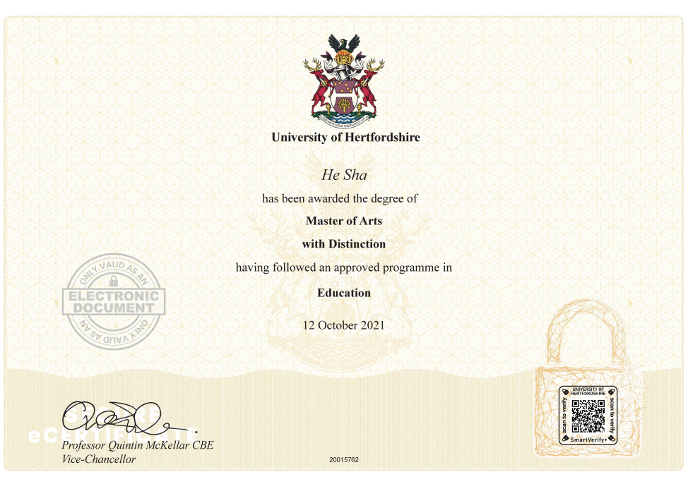 This award is valid and was issued by University of Hertfordshire to He Sha on the date stated within the award